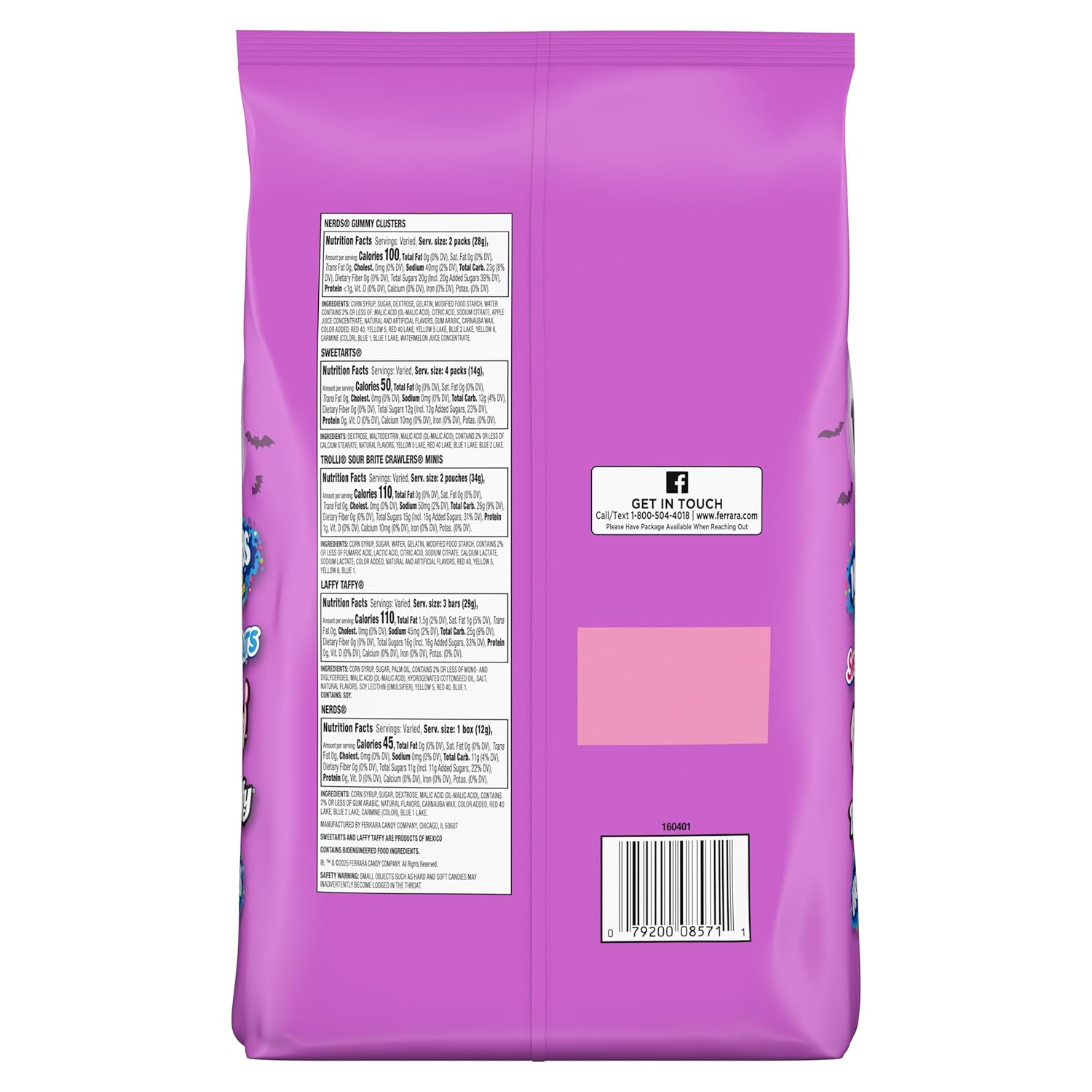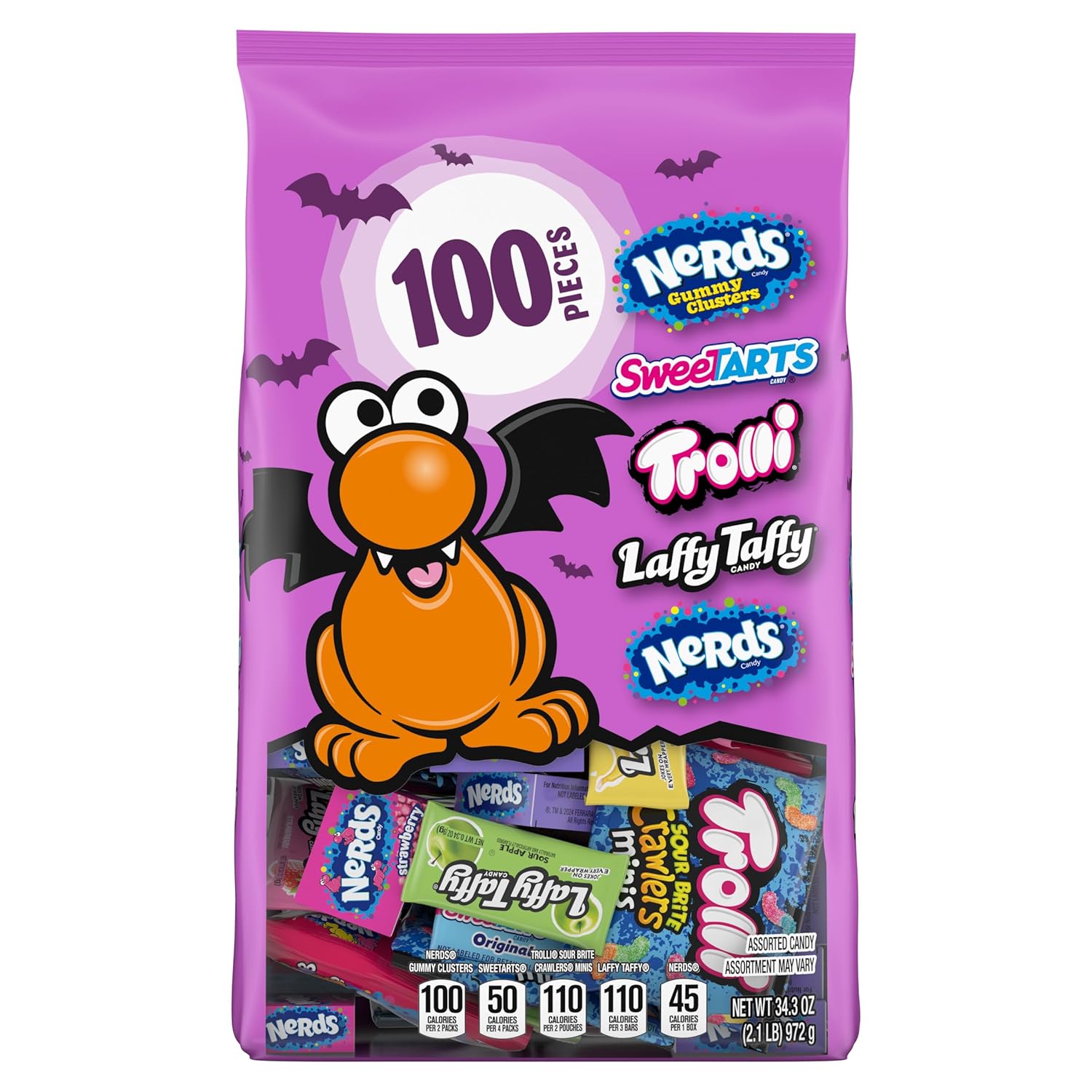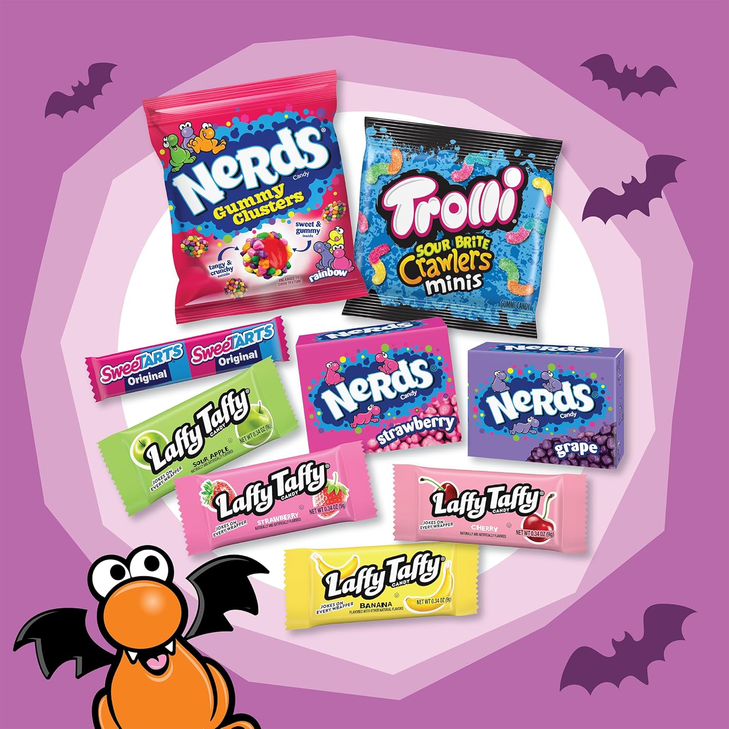 - GRAB-AND-GO. SHAREABLE TREATS: 100 individually wrapped candy pieces including Nerds Gummy Clusters. Nerds Candy Original Strawberry and Grape. Trolli Sour Brite Crawler Minis. SweeTARTS Original. and Laffy Taffy Candy with Jokes on Every Wrapper.