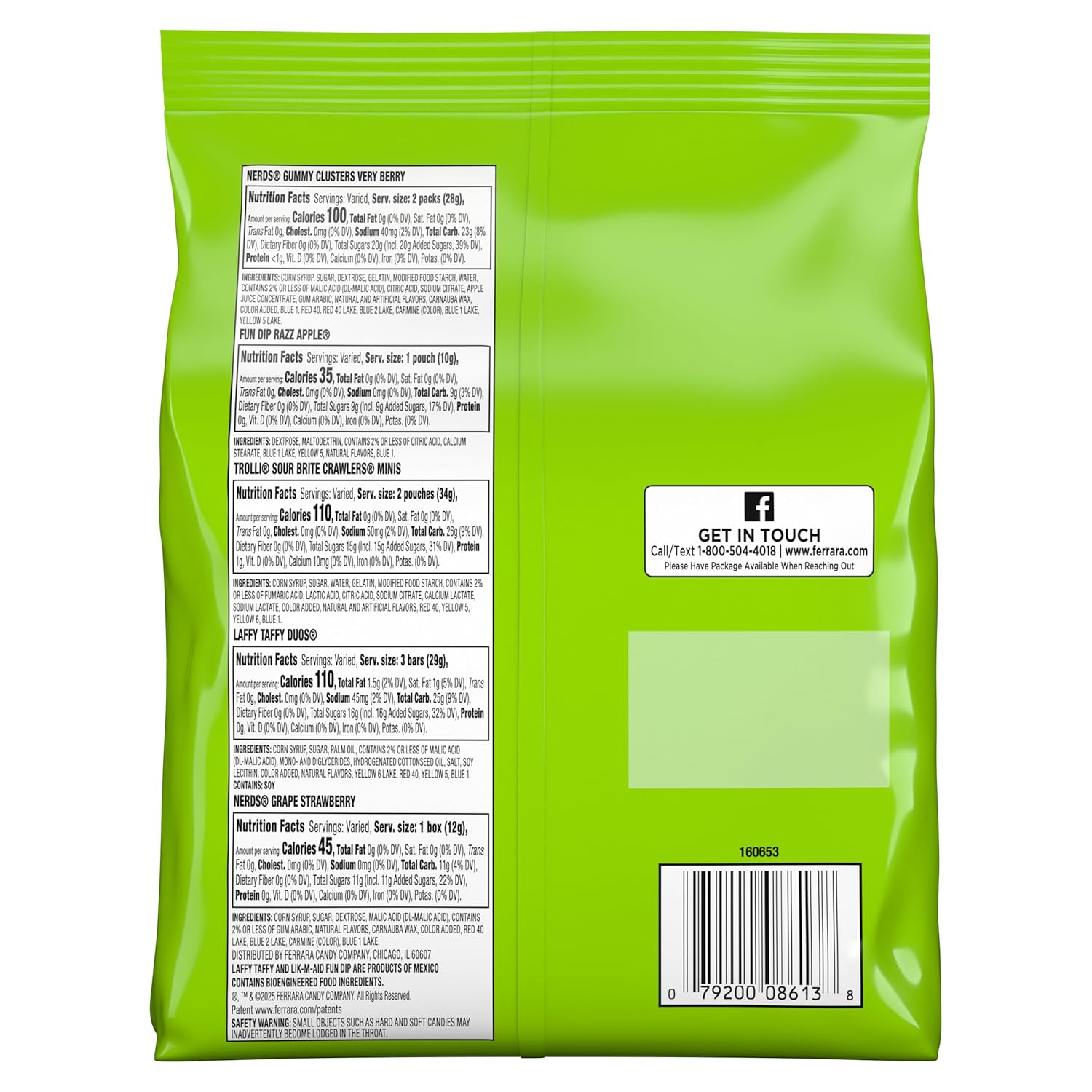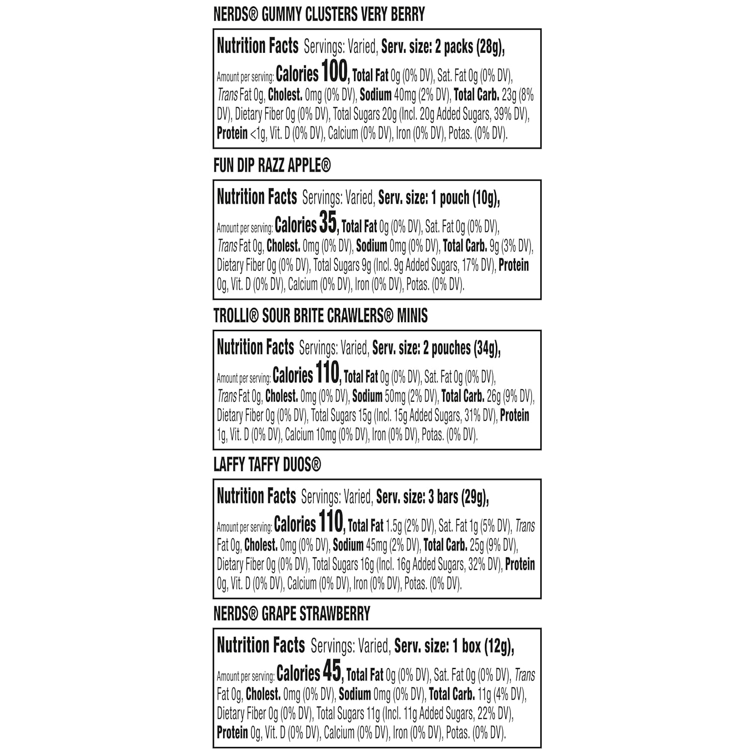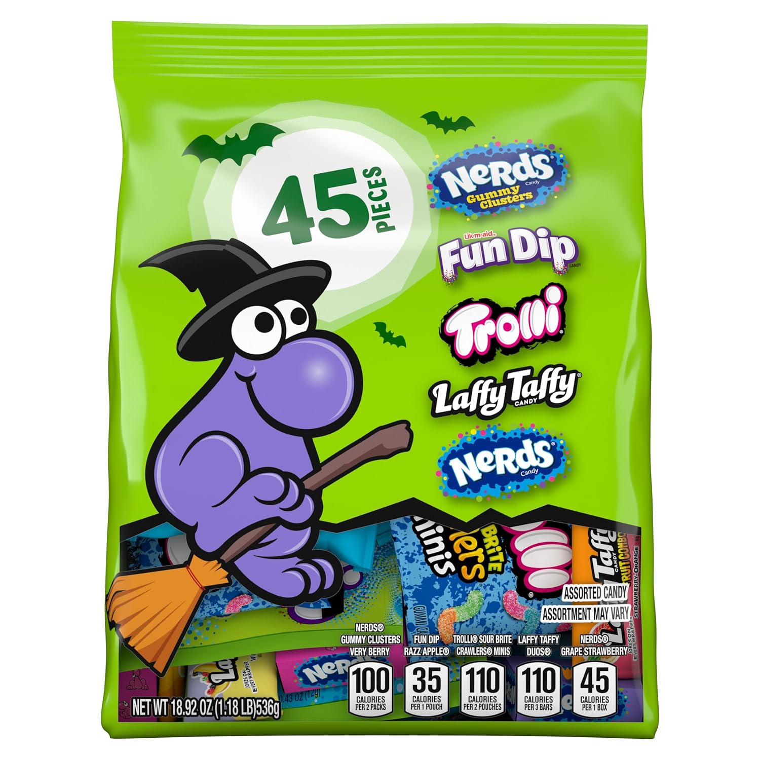 - HALLOWEEN FAN FAVORITES: The Perfect Halloween Candy Haul with our 45-count variety pack. including NERDS Verry Berry Gummy Clusters. Fun Dip Razz Apple. Trolli Sour Brite Crawlers Minis. Laffy Taffy Duos. and NERDS.