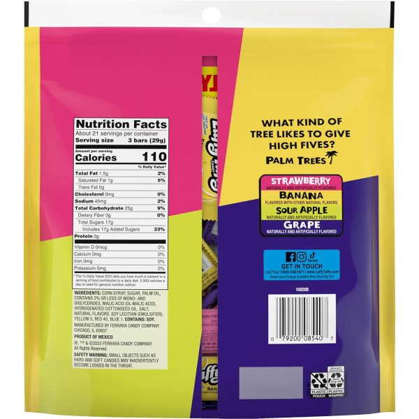 - FRUITY VARIETY: Laffy Taffy Assorted Mini Bars (22oz) turn each bite into delight with a long-lasting fruity flavor made to savor. This pack includes strawberry. banana. sour apple and grape flavors